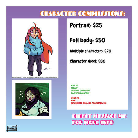 For more involved projects/projects for a company or org/projects for commercial use, the prices and guidelines are different and I would prefer if we discussed them directly. If you like my work and think it would be a good fit for you please feel free to hit me up with any questions!